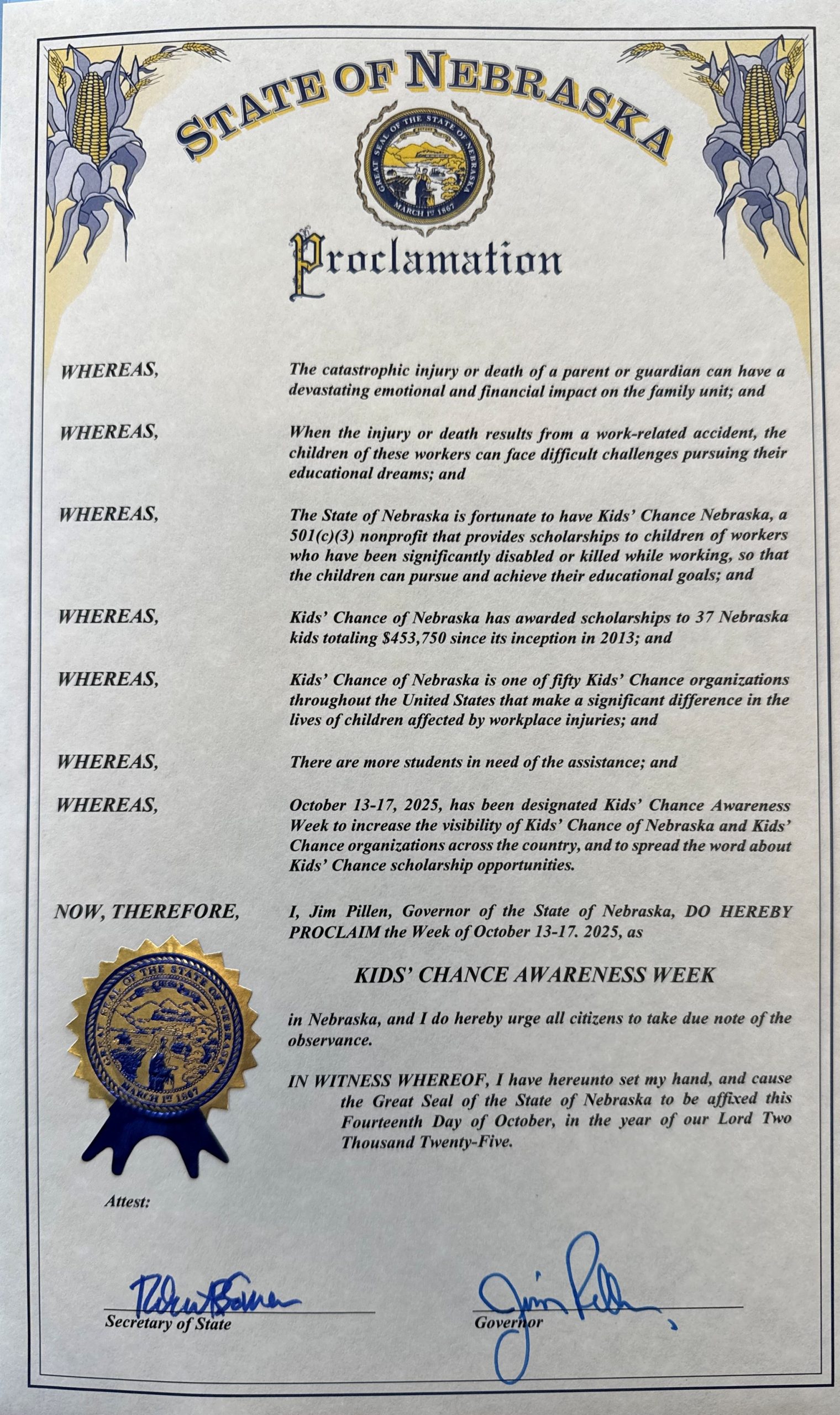 Governor Pete Ricketts, accompanied by Kid’s Chance Board Members proclaimed November 12th-16th, 2018 to commemorate Kids’ Chance Awareness Week, bringing even more recognition to the cause.
